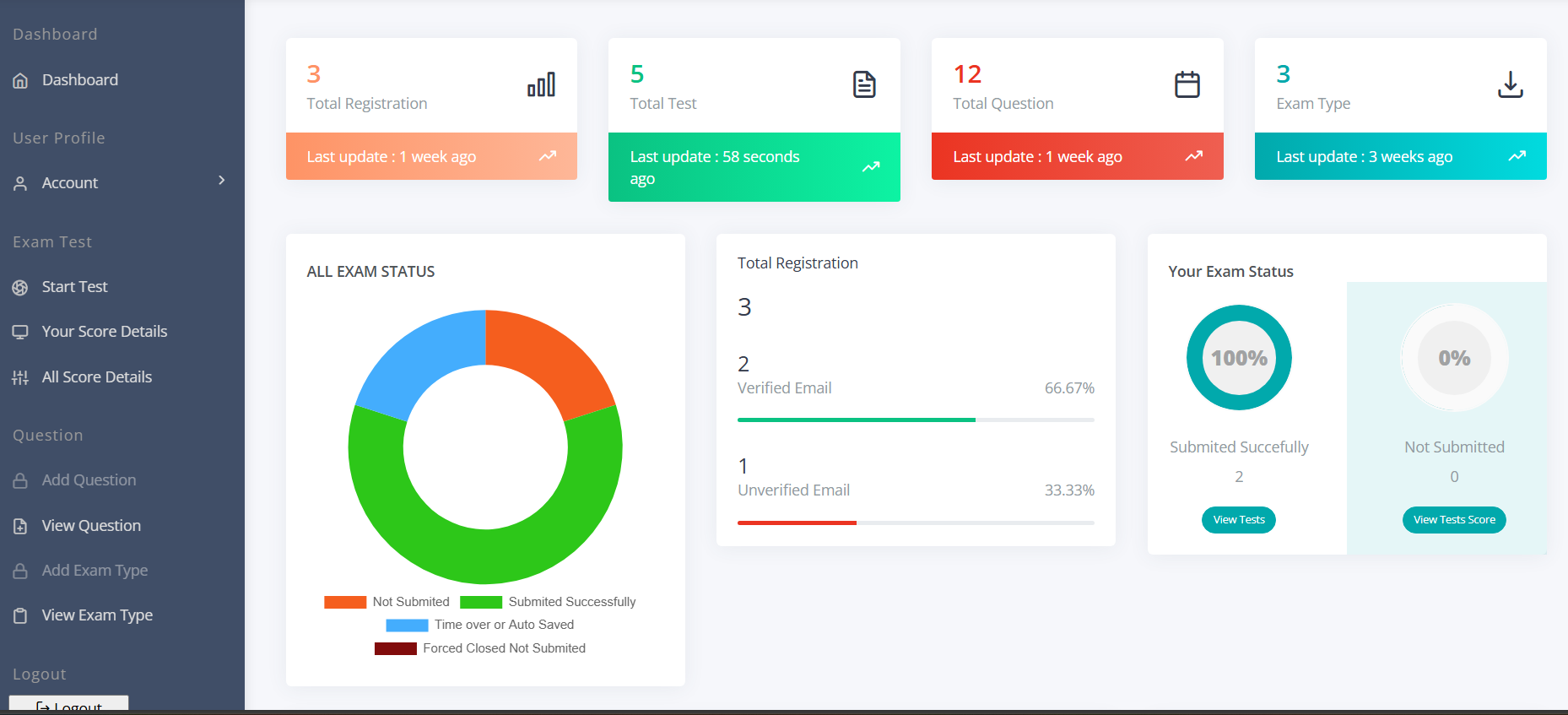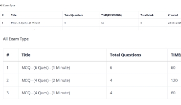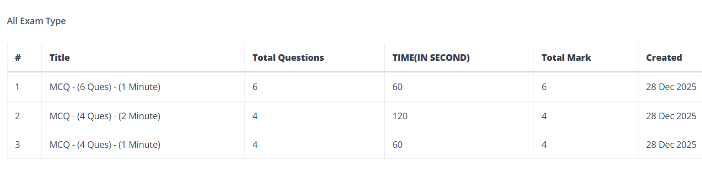 Admin can configure exam duration such as 2-minute or 3-minute tests based on requirements.