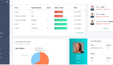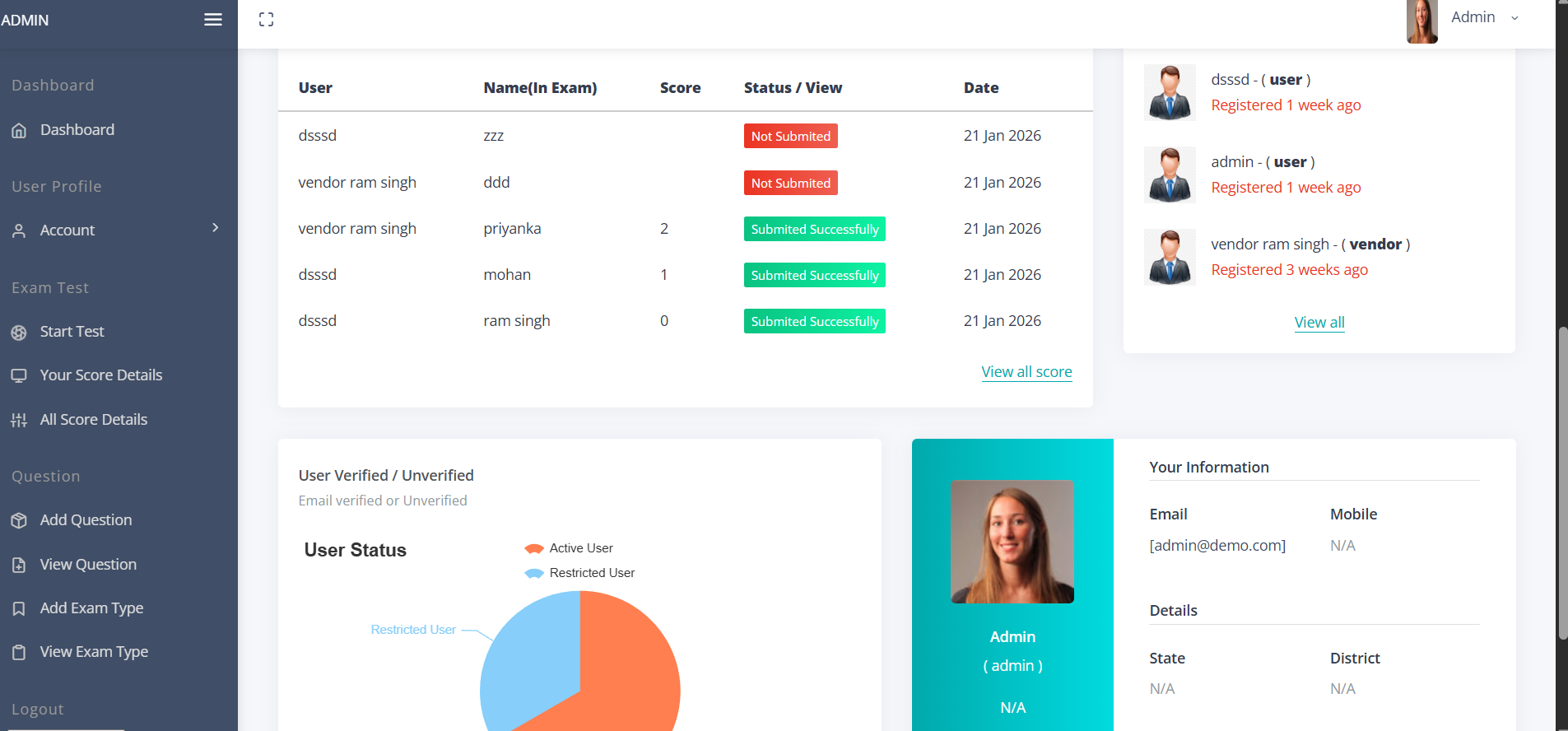 Admin Quick overview of tests, scores, and activities.