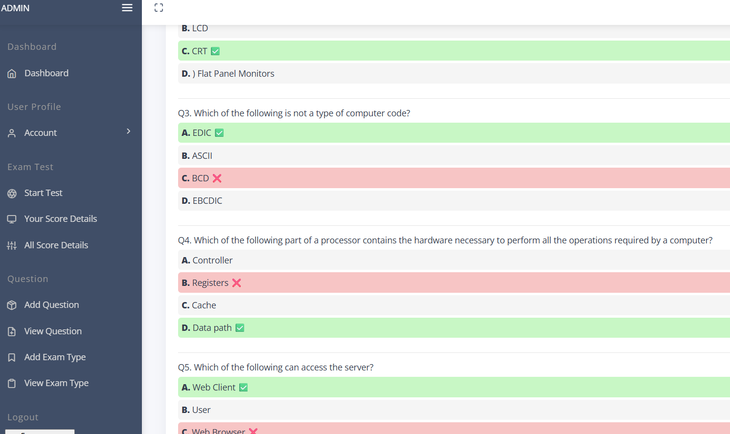 Admin can add, edit, and manage questions and answers for different online tests.